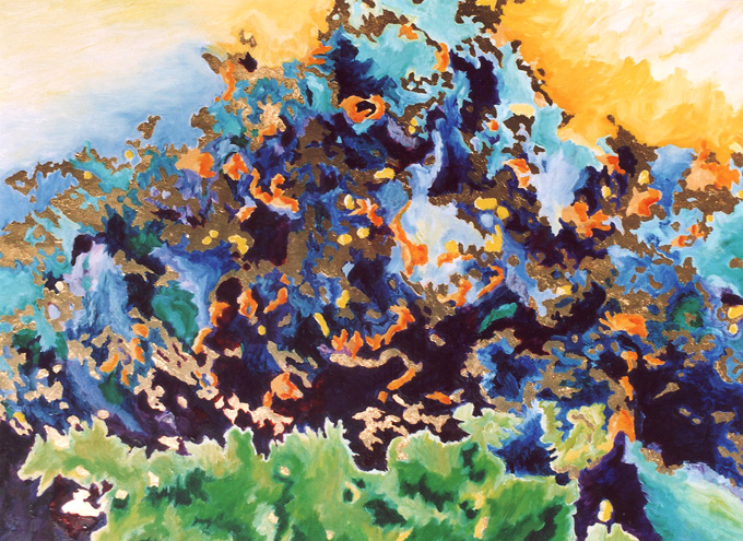 Green rock 1997 oil, gold leaf on wooden plate 60 cm x 45 cm
